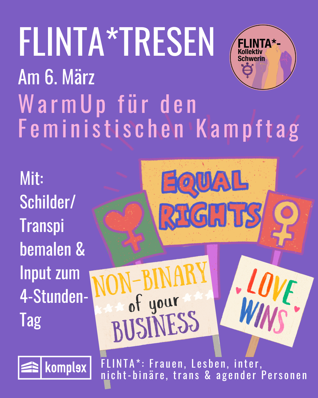 FLINTA*-KOLLEKTIV SCHWERIN Veröffentlicht am 8. Oktober 2024 FLINTA*-KOLLEKTIV SCHWERIN ?FLINTA* Tresen ?feminiSN ?Feministisch. Fresh. Inklusiv. ✊Offene Treffen. Join us! Website Facebook Instagram Current Events Upcoming Events Past Events Zurzeit sind keine Veranstaltungen vorhanden. Zurzeit sind keine Veranstaltungen vorhanden. 05 Sep. 05 Sep. - 06 Sep. Soli-Tresen – CSD Grevesmühlen 05.09.2025 @ 19:00 - 06.09.2025 Komplex Schwerin 04 Juli 04 Juli - 05 Juli FLINTA* Tresen 04.07.2025 @ 20:00 - 05.07.2025 @ 02:00 Komplex Schwerin 04 Apr. 04 Apr. - 05 Apr. FLINTA*Tresen / Karaoke 04.04.2025 @ 20:00 - 05.04.2025 @ 02:00 Komplex Schwerin 07 März 07 März - 08 März FLINTA* Tresen 07.03.2025 @ 20:00 - 08.03.2025 @ 02:00 Komplex Schwerin 07 Feb. 07 Feb. - 08 Feb. FLINTA* Tresen 07.02.2025 @ 20:00 - 08.02.2025 @ 02:00 Komplex Schwerin 01 Feb. 01 Feb. FLINTA*-Kollektiv presents: Soundtechnik Workshop No2 (FLINTA* only) – wird verschoben. 01.02.2025 @ 12:00 - 18:00 Komplex Schwerin 17 Jan. 17 Jan. - 18 Jan. FLINTA* Kollektiv presents: Punk as F*ck // Lesung / ALL GENDER WELCOME 17.01.2025 @ 20:00 - 18.01.2025 @ 02:00 Komplex Schwerin 06 Dez. 06 Dez. - 07 Dez. FLINTA*Tresen / mit Lesung 06.12.2024 @ 20:00 - 07.12.2024 @ 02:00 Komplex Schwerin 10 Nov. 10 Nov. - 10 Nov. FLINTA* to the Front (of House) /// Tontechnik-Workshop 10.11.2024 @ 16:00 - 10.11.2024 @ 19:00 Komplex Schwerin 23 Nov. 23 Nov. - 23 Nov. Only FLINTA* DJ Workshop (Vinyl und CDJ) – ( ohne Anmeldung ) 16 – 18 Uhr 23.11.2024 @ 16:00 - 23.11.2024 @ 18:00 Komplex Schwerin