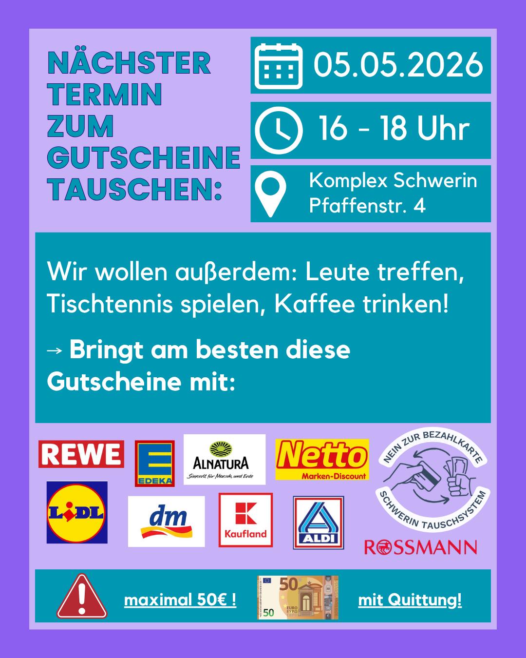 Komm vorbei, wenn du eine Bezahlkarte hast oder wenn du Bargeld in Gutscheine tauschen willst. Nebenbei wollen wir uns connectenđŸ€, Kaffee trinken ☕und Tischtennis spielen.🏓