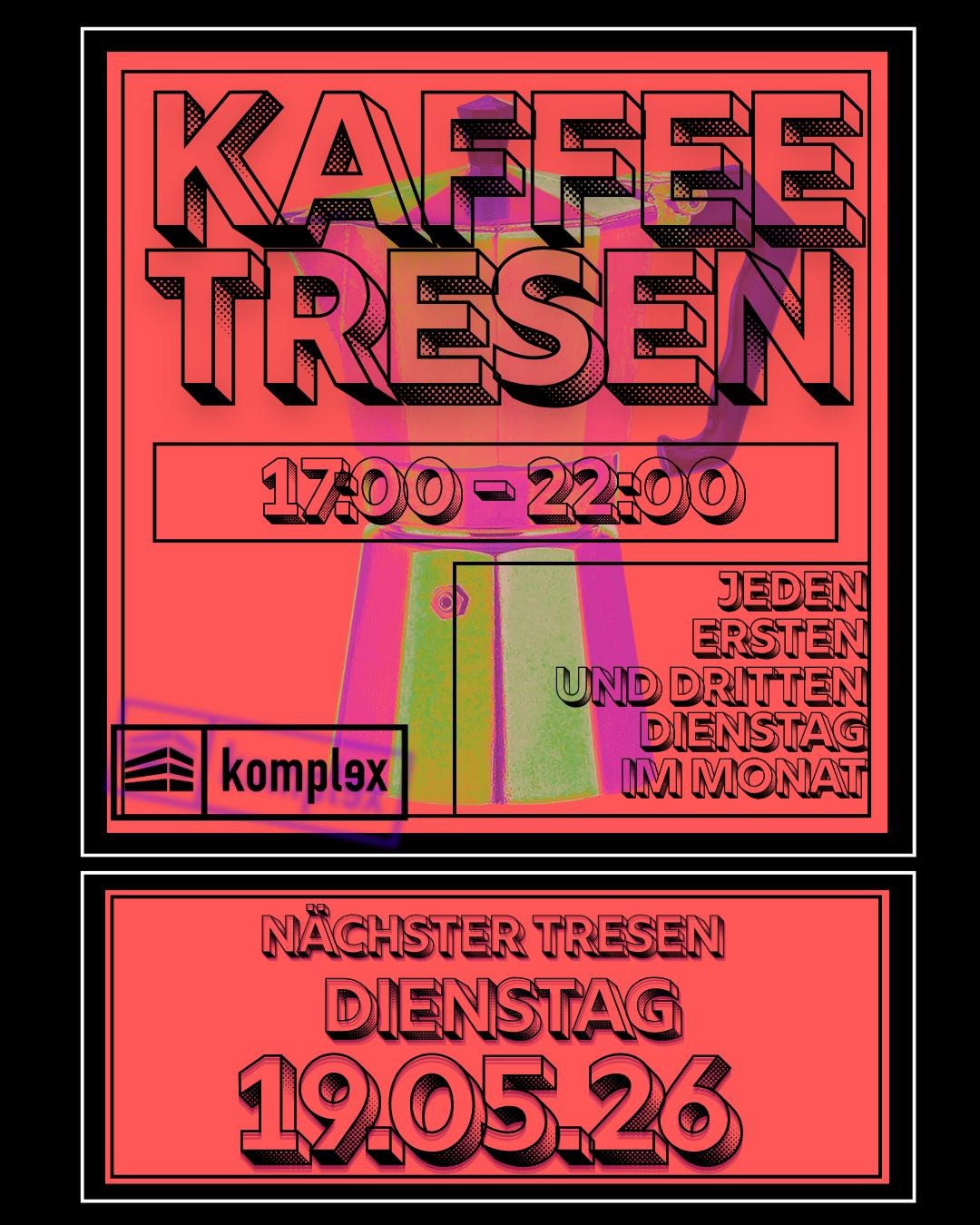 Kaffeetresen Veröffentlicht am 16. April 202616. April 2026 Kaffeetresen von Komplex Schwerin 4 4 people viewed this event. Für Veranstaltung registrieren Um dich für diese Veranstaltung zu registrieren, besuche den folgenden Link: https://komplex-schwerin.de/keine-registrierung-notwendig/ → Datum und Uhrzeit 19.05.2026 @ 17:00 bis 19.05.2026 @ 22:00 Ort Komplex Schwerin Share With Friends Facebook Twitter LinkedIn Xing Pinterest