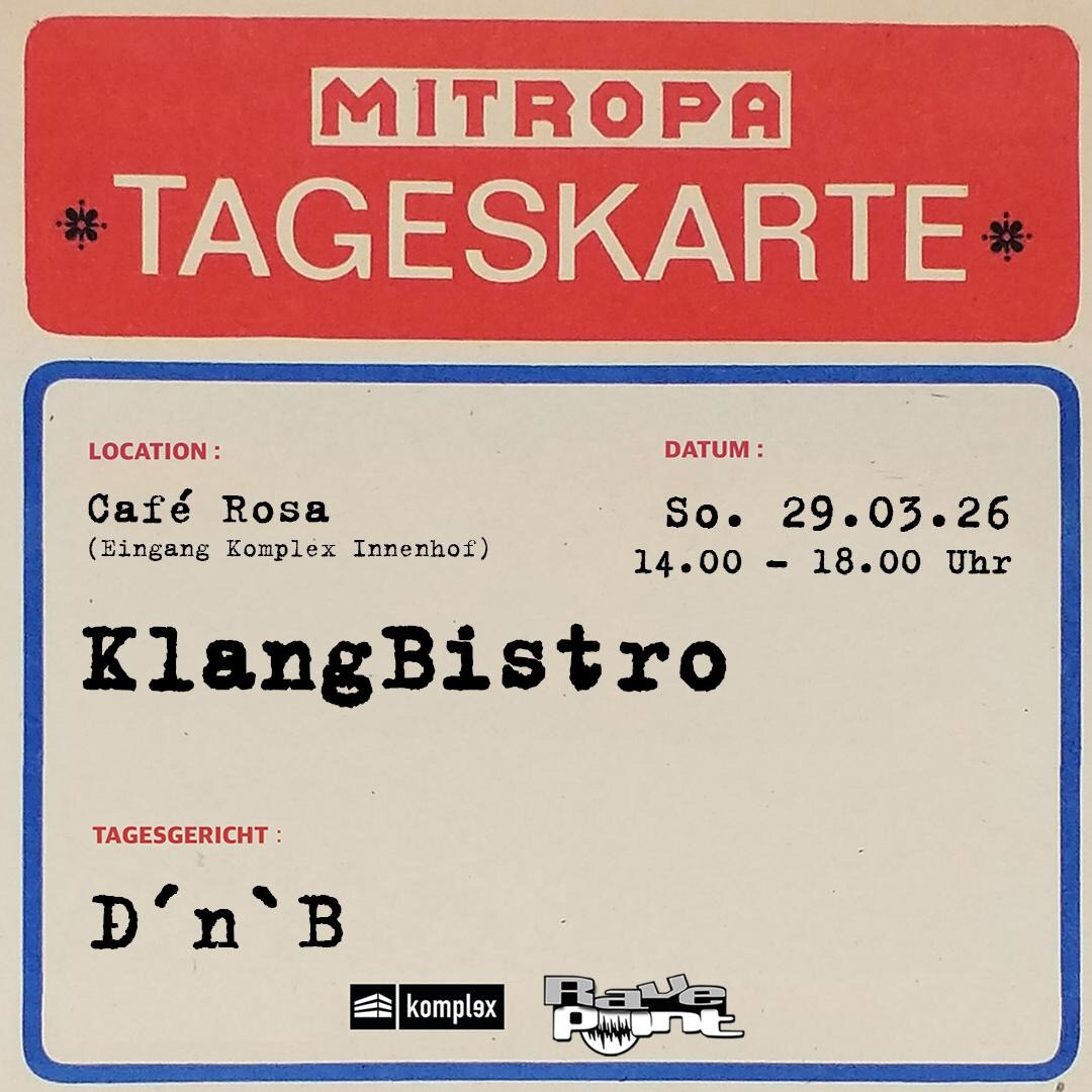 Vergiss Kaffee und Kuchen natürlich nicht, denn den gibt es beim KlangBistro. Außerdem wird diesen Sonntag D’n’B serviert. Schnapp dir deine Tanzschuhe und komm ins Café Rosa. Der perfekte Start in den Sonntagnachmittag mit feinsten Beats.